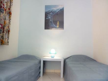 Pour avoir plus de détails et réserver cet hébergement, choisissez une date ci-dessus et cliquez sur voir l'offre ! Vous serez redirigé vers le site proposant la location.Apt 3 pièces 38 m2 au 1er étage: séjour/salle à manger avec 1 divan-lit et TV. 1 chambre avec 1 grand-lit. 1 chambre avec 1 x 2 lits superposés. Coin cuisine (2 plaques de cuisson, mini-four). Douche, WC séparé. Terrasse 8 m2, situation sud. Meubles de terrasse. Vue sur la mer.