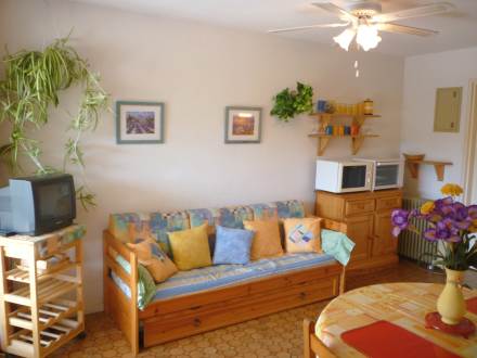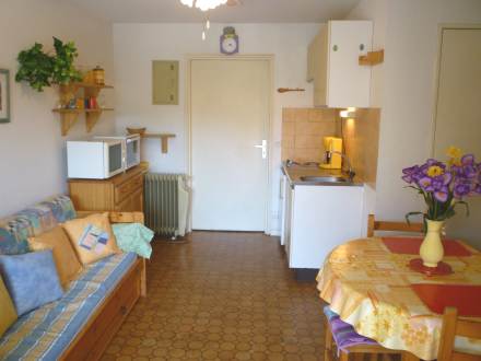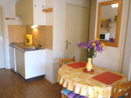 Apt 2 pièces 25 m2 au 1er étage: séjour/salle à manger avec 1 lit gigogne, TV et radiateur. 1 chambre avec 1 grand-lit. Coin cuisine (2 plaques de cuisson, mini-four, four micro-ondes). Douche/WC. Balcon 5 m2, situation ouest. Meubles de terrasse. Maximum 1 animal/ chien autorisé.