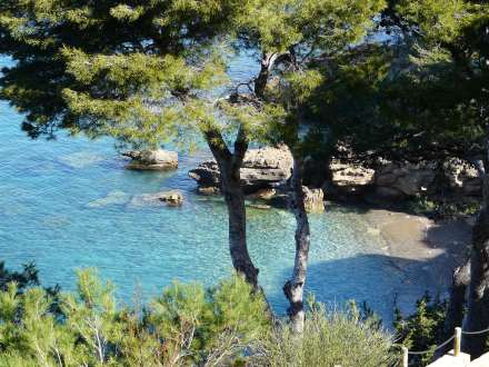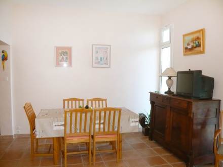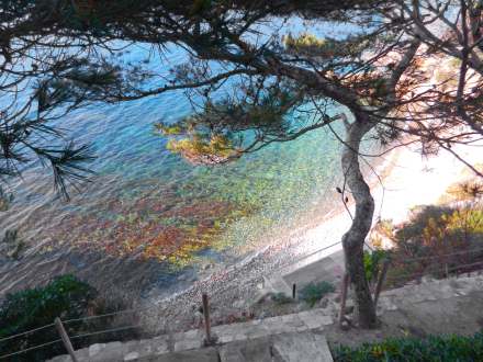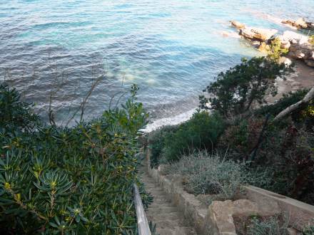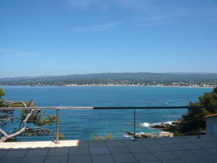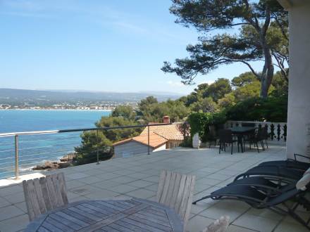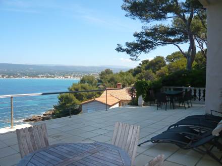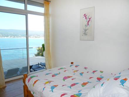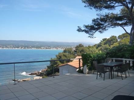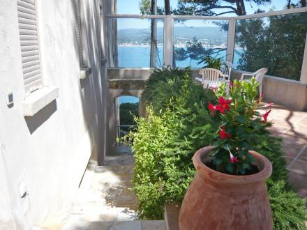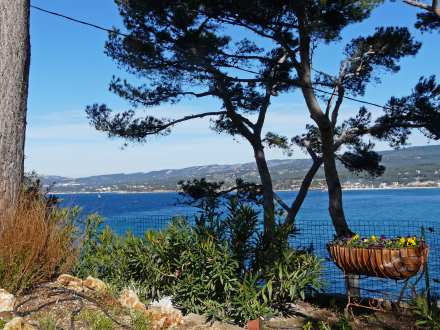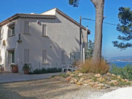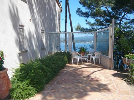 Apt 2 pièces 50 m2: séjour/salle à manger avec 1 divan-lit double (140 cm), TV (satellite), lecteur CD et chaîne stéréo. Sortie sur la terrasse. 1 chambre avec 1 grand-lit (140 cm). Cuisine ouverte (2 plaques de cuisson, lave-vaisselle, four micro-ondes, congélateur, gril). Douche/WC. Chauffage électrique. Terrasse 75 m2. Meubles de terrasse, chaises longues. Très belle vue panoramique sur la mer. A disposition: lave-linge. Internet (Connexion WIFI, gratuit). L'accès à la maison se fait par 20 marches en descente. L'accès à la crique pour baignade est privé et se fait également par des marches. Terrasse de 25 m² au dessus du garage à bateau. Appartement idéal pour deux adultes et deux enfants. Barbecue charbon et bois interdit.