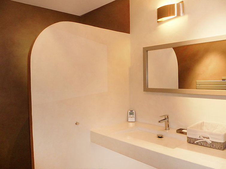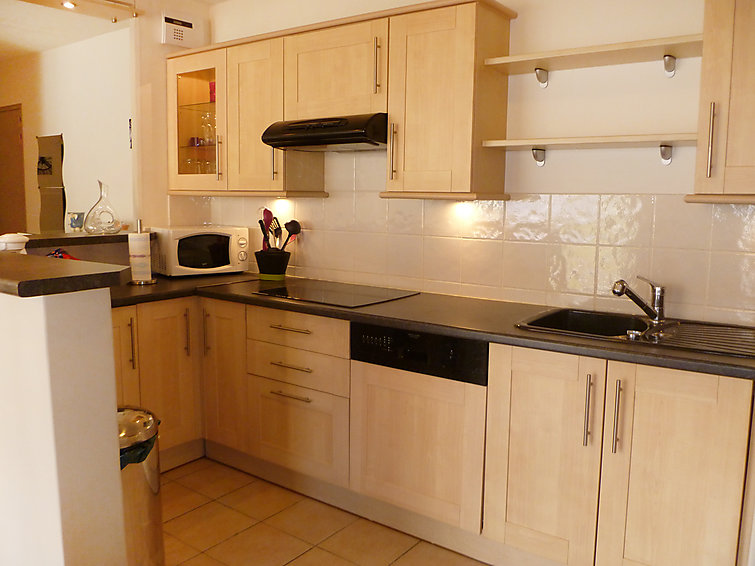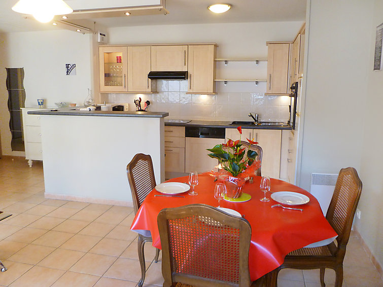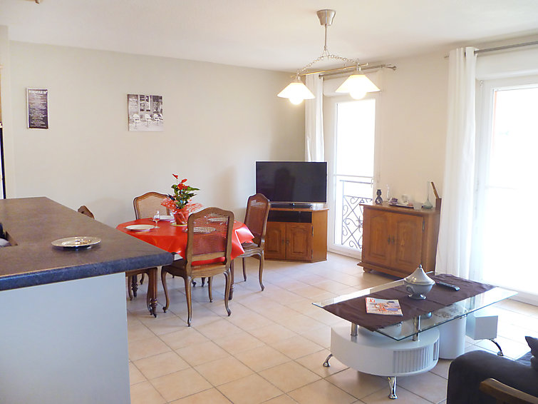 Apt 3 pièces 60 m2 au 1er étage. Aménagement confortable et agréable: séjour/salle à manger avec table pour les repas et TV (écran plat). Sortie sur la terrasse. 1 chambre avec 1 grand-lit (160 cm, longueur 200 cm). Sortie sur la terrasse. 1 chambre avec 1 divan-lit (140 cm, longueur 190 cm). Cuisine ouverte (four, lave-vaisselle, 3 plaques à induction, four micro-ondes, congélateur, cafetière électrique). Douche, WC séparé. Chauffage. Grande terrasse 16 m2, couverte. Meubles de terrasse. A disposition: lave-linge. Place de parking No P38. Veuillez noter: adapté(e) aux familles. TV seulement FR.