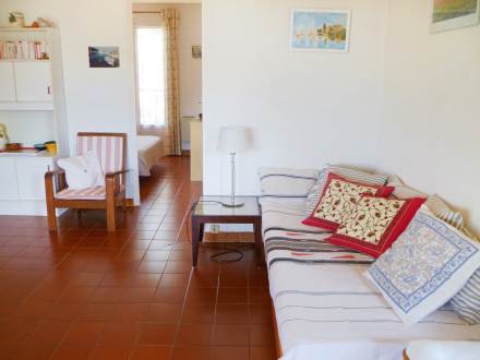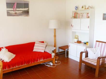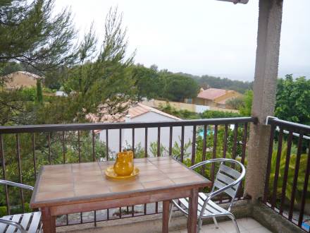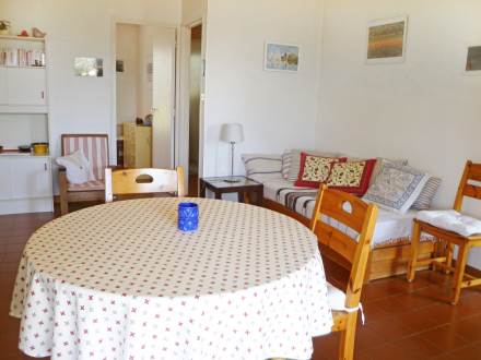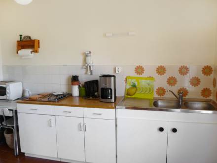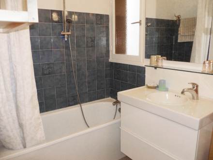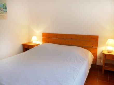 Apt 2 pièces 45 m2 au 1er étage: séjour/salle à manger avec 2 lits gigognes (2 pers. 2 x 80 cm, longueur 190 cm), table pour les repas et TV. Sortie sur la terrasse. 1 chambre avec 1 grand-lit (1 x 140 cm, longueur 190 cm). Cuisine ouverte (4 plaques de cuisson, mini-four, four micro-ondes, congélateur, cafetière électrique). Salle de bains, WC séparé. Chauffage électrique. Terrasse 8 m2, couverte. Meubles de terrasse. Place de parking près de la maison. Veuillez noter: maximum 1 animal/ chien autorisé. TV seulement FR.