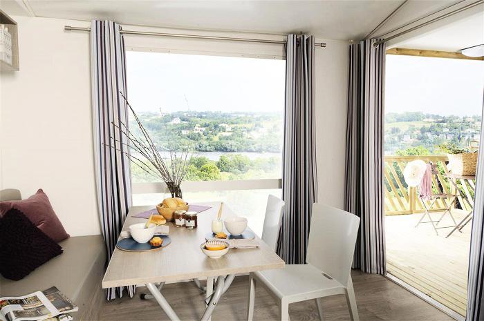 de 31m², ce mobil home dispose de 2 chambres, une cuisine équipée, une salle de bain avec toilettes séparées, une TV et une terrasse semi couverte avec salon de jardin.