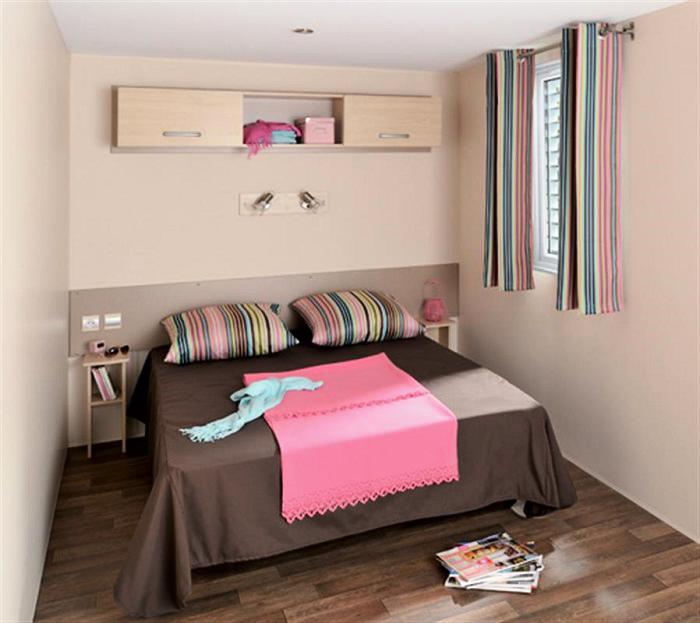 Mobil Home 3 Pièces 2/4 Personnes de 31m² composé de 2 chambres, d'une cuisine équipée, d'une salle de bain avec toilettes séparées, d'une TV et d'une terrasse semi couverte.