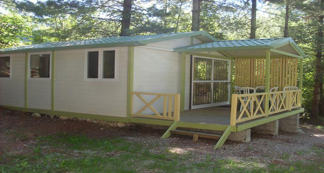 Chalet de 27m² pour 5 personnes composé d'un coin cuisine équipé, d'une chambre avec un lit double, d'une chambre avec 3 lits simples dont 2 lits superposés, d'une salle de bains, de toilettes indépendants et d'une terrasse couverte.