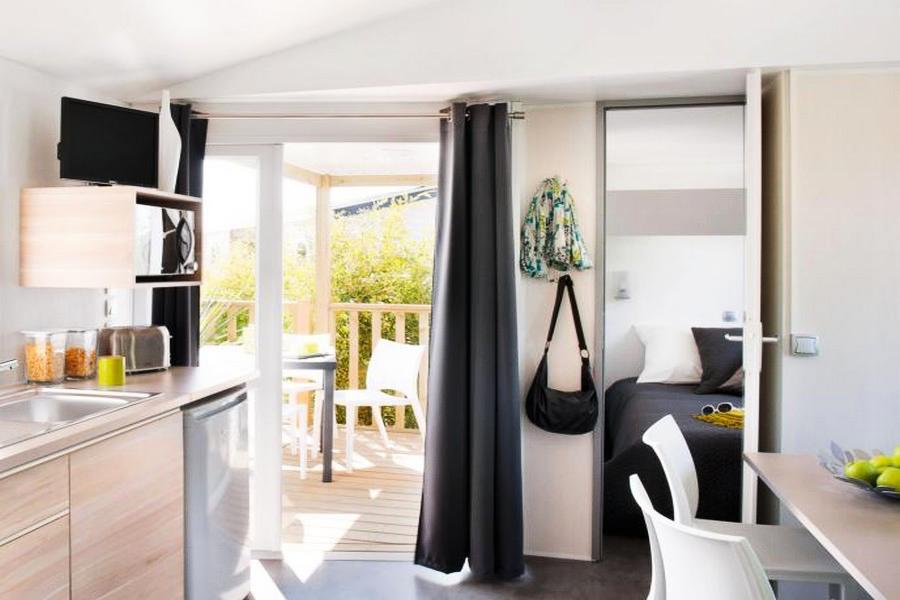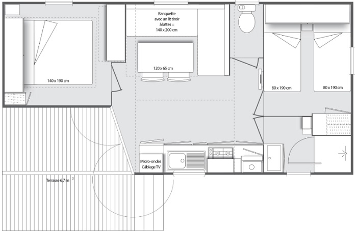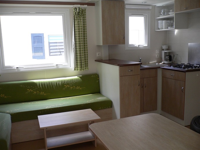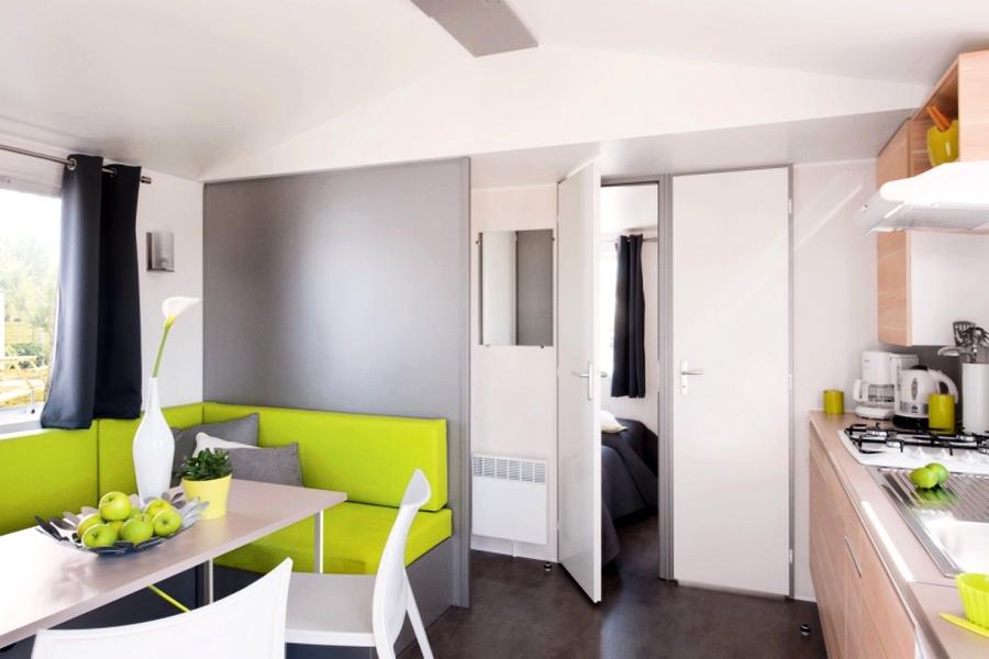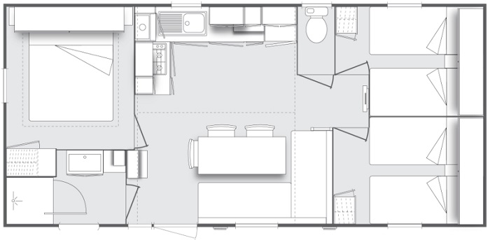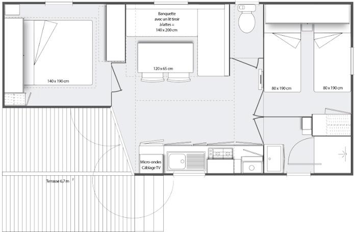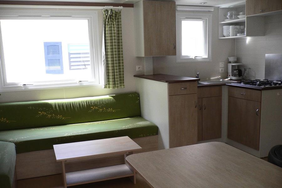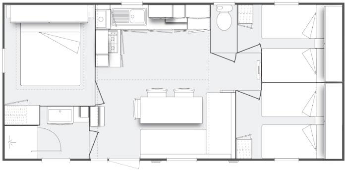 Mobil-home 3 pièces 4/5 personnes de 25m² environ composé d'un séjour avec une banquette convertible en lit pour une personne (80x190), d'un coin repas, d'une kitchenette équipée, d'une chambre avec un lit double (140x190), d'une seconde chambre avec deux lits simples (80x190), d'une salle de douche avec WC séparés et d'une terrasse en bois semi-couverte. Ancienneté: de 2016