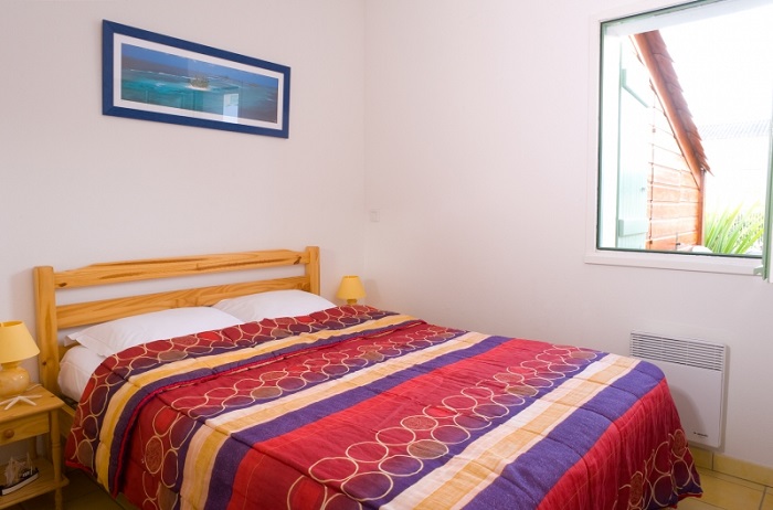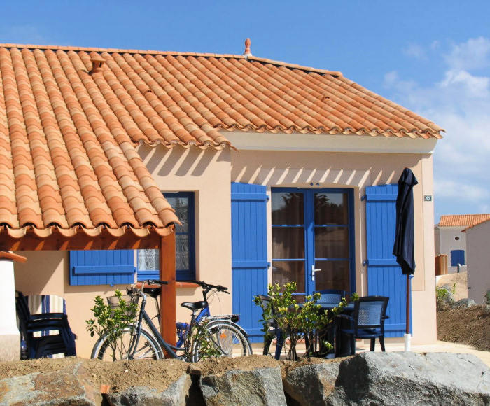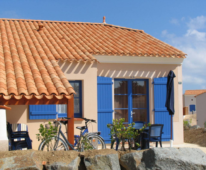 Maison entre 38 et 44m² pour 4/5 personnes, composée d'une kitchenette équipée, d'un séjour avec un canapé, d'une chambre avec 2 couchages, d'une mezzanine avec 2 ou 3 couchages, d'une salle de bains avec une baignoire ou une douche, des WC indépendants, et un jardinet privatif avec une terrasse. Certains jardinets peuvent avoir un abri couvert (non garanti).