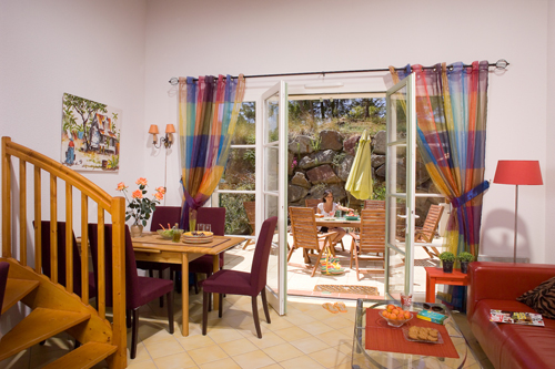 Superficie d'environ 38-44 m². Séjour avec canapé. Chambre avec lit double. Mezzanine avec 3 couchages. Cuisine avec four, 2 plaques vitrocéramiques, réfrigérateur. Salle de bains avec baignoire ou douche. WC séparé. Terrasse. Jardin.