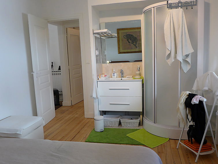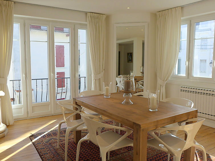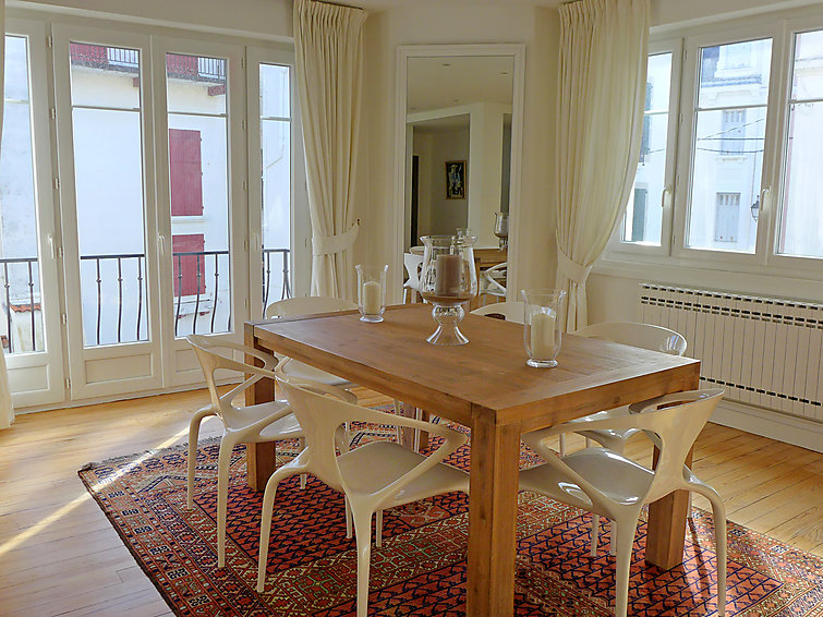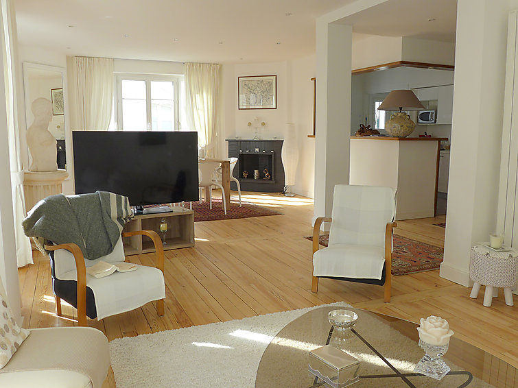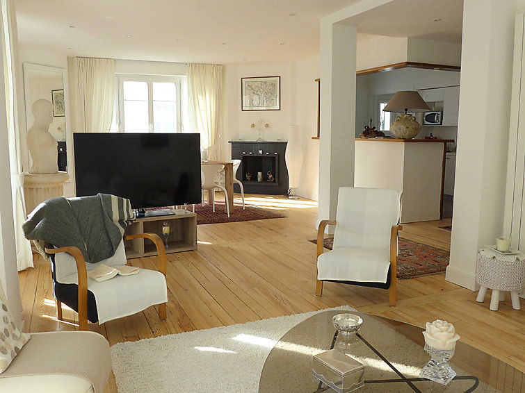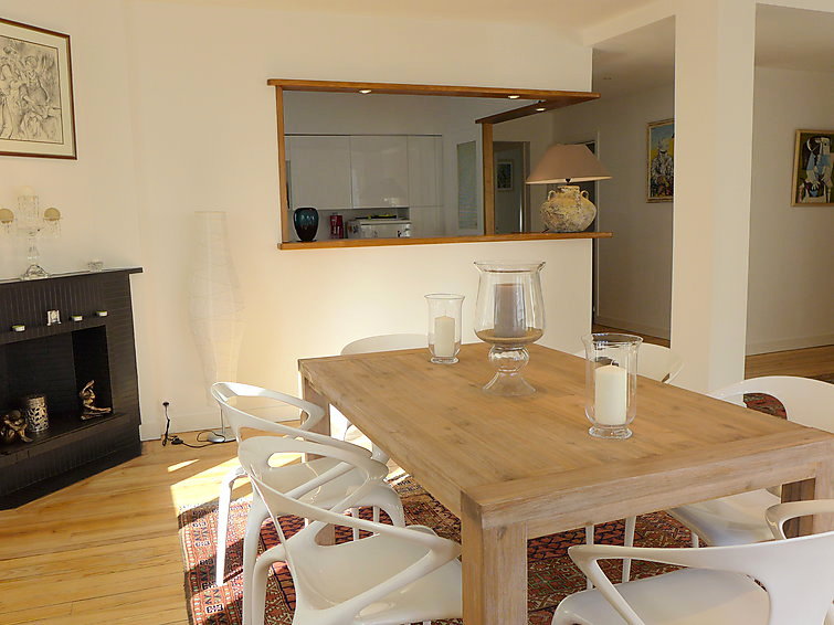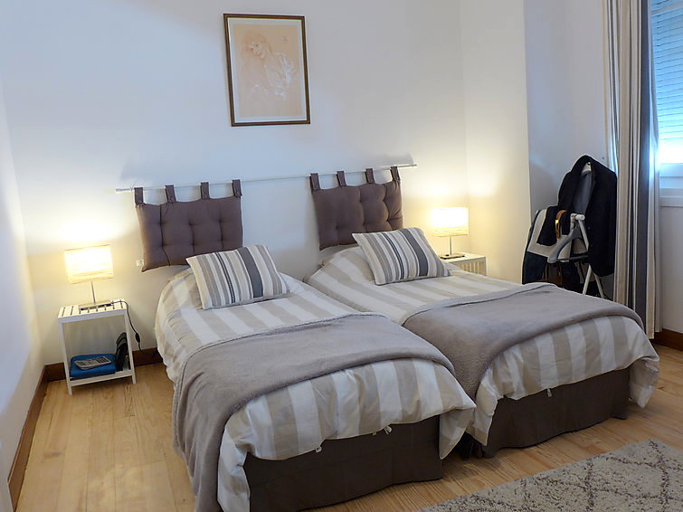 Apt 3 pièces 113 m2 au 1er étage. Aménagement agréable et de bon goût: séjour/salle à manger avec TV (écran plat). 1 chambre avec 1 grand-lit (1 x 160 cm), lavabo et douche. 1 chambre avec 2 lits (90 cm), TV (écran plat). (5 plaques de cuisson, four, lave-vaisselle, congélateur). Douche, WC séparé, double vasque. Chauffage au gaz. A disposition: lave-linge, fer à repasser, sèche-cheveux. Internet (Connexion WIFI). Place de parking. Veuillez noter que l'accès à l'appartement se fait par un escalier.