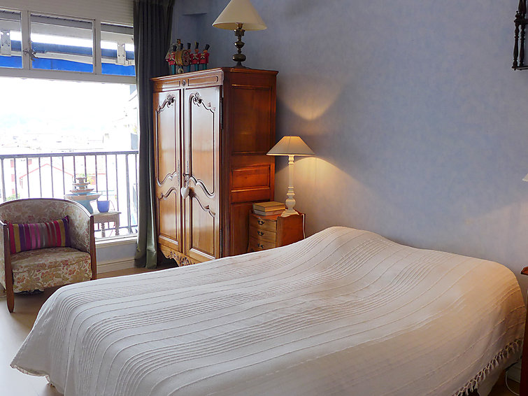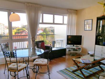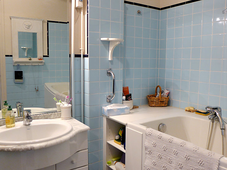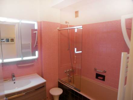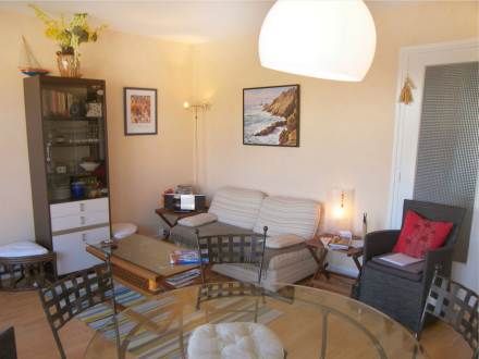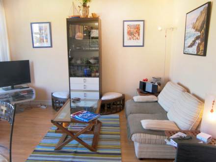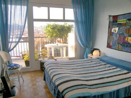 Apt 3 pièces 66 m2 au 6ème étage, clair, aménagement confortable et agréable: séjour/salle à manger avec 1 divan-lit (130 cm), TV, écran plat, chaîne stéréo et DVD. Sortie sur la terrasse. 1 chambre avec 2 lits gigognes (2 pers. 2 x 90 cm), TV. 1 chambre avec 1 grand-lit (140 cm), TV. Sortie sur la terrasse. Cuisine (4 plaques de cuisson, four, lave-vaisselle, four micro-ondes, cafetière électrique). Sortie sur la terrasse. Salle de bains, WC séparé. Grande terrasse 15 m2. Meubles de terrasse. Vue éloignée sur la mer. A disposition: lave-linge.