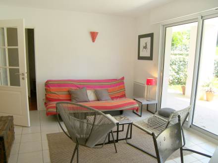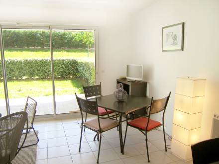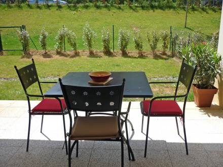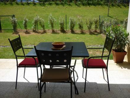 Apt 2 pièces 45 m2, au rez-de-chaussée: séjour/salle à manger avec 1 divan-lit (140 cm), TV. Sortie sur le jardin, sur la terrasse. 1 chambre avec 1 grand-lit (160 cm), lavabo et douche. Sortie sur la terrasse. Grande cuisine ouverte (four, lave-vaisselle, plaque vitro céramique, cafetière électrique) avec table pour les repas. WC séparé. Grande terrasse 20 m2, situation sud, petit jardin 45 m2. Meubles de terrasse. Place de parking No 141 (couvert).