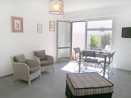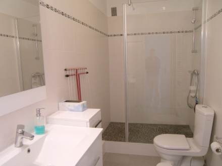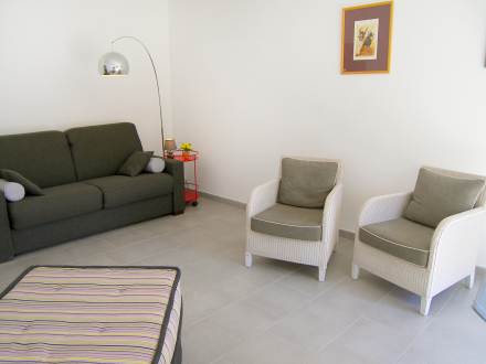 Studio 30 m2 au 1er étage, situation sud, clair, aménagement moderne et de bon goût: séjour/chambre à coucher avec baie vitrée avec 1 divan-lit (140 cm, longueur 190 cm), table pour les repas et TV (écran plat). Sortie sur la terrasse. Petite cuisine (4 plaques de cuisson, lave-vaisselle, plaque vitro céramique, four micro-ondes). Sortie sur la terrasse. Bain/WC. Grande terrasse 20 m2, situation sud et situation est. Meubles de terrasse, chaises longues. A disposition: lave-linge. Place de parking (couvert).