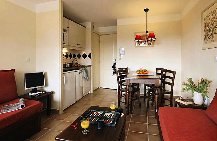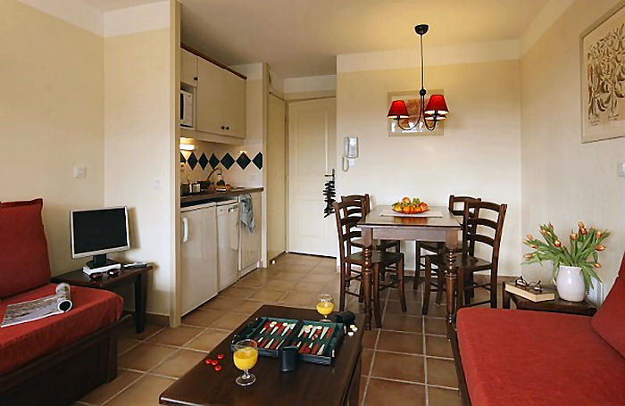 Appartement avec un coin cuisine entièrement équipé de 4 plaques vitro-céramiques, d'un réfrigérateur, d'un four, d'un lave-vaisselle et d'une cafetière électrique. Téléphone (payant), télévision, coffre-fort (payant) sauf dans les studios pour personnes à mobilité réduite. Terrasse, balcon ou loggia. Certains des appartements en rez-de-chaussée ont un rez-de-jardin.