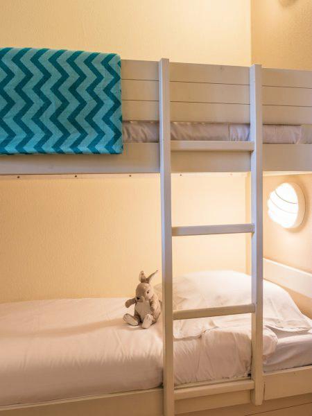 Appartement de deux pièces de 42m² pour sept personnes comprenant un séjour avec deux lits banquettes et un lit gigogne, une chambre avec un lit double, une cabine avec deux lits superposés, une salle de bains avec des toilettes indépendants, une salle de douche avec des toilettes.