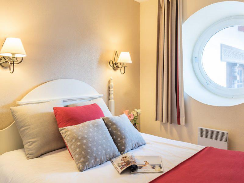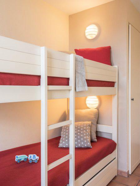 Appartement de deux pièces de 32m² pour cinq personnes comprenant un séjour avec deux banquettes lits et un lit gigogne, une chambre avec un lit double, une salle de bains avec des toilettes indépendants.
