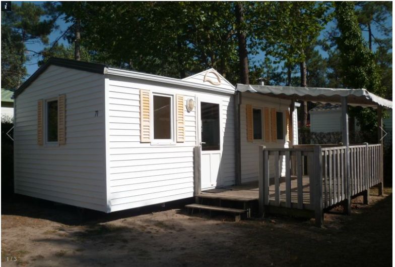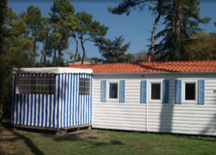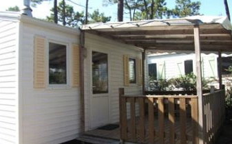 Mobil Home de 28m² pouvant accueillir jusqu'à 5 personnes, composé d'un coin cuisine, d'une chambre avec un lit double, d'une chambre avec 3 lits simples dont 1 superposé pour enfant et d'une sale de douche avec WC. Il dispose également d'une terrasse semi-couverte