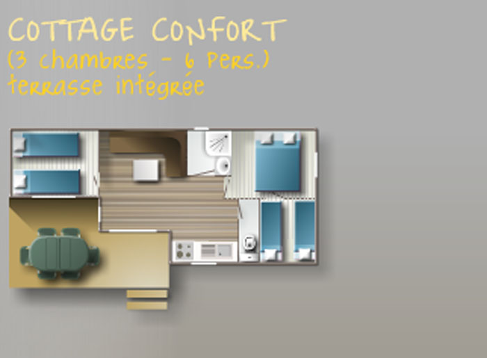 Le mobil home 4 Pièces 6 Personnes comprend une pièce à vivre avec coin cuisine équipé, une chambre avec lit double, deux chambres avec 2 lits simples, un coin douche avec lavabo. WC séparé. A l?extérieur, une terrasse intégrée et fermée avec salon de jardin. Barbecue non compris.