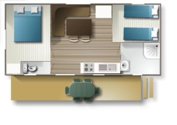 Mobil Home 3 Pièces 4 Personnes, de 20m², composé d'une pièce à vivre, d'un coin cuisine, d'une chambre avec un lit double, d'une chambre avec 2 lits simples, d'un coin douche et de WC séparé. Il dispose également d'une terrasse en bois couverte avec salon de jardin.