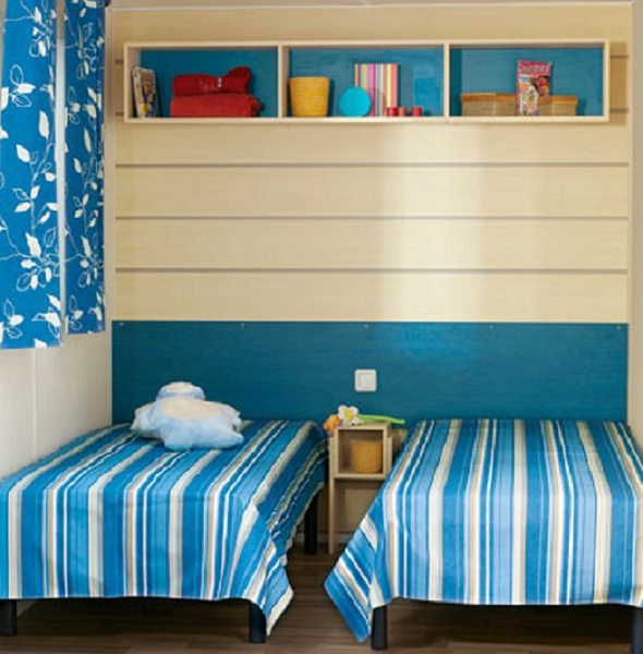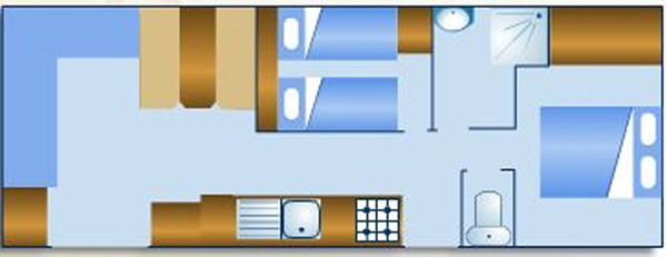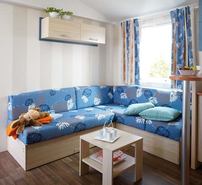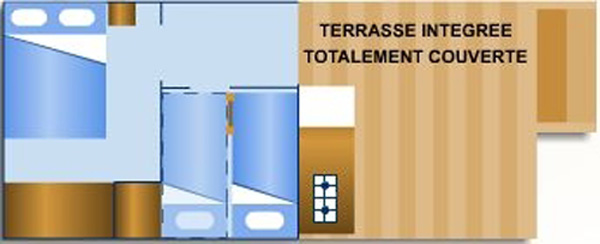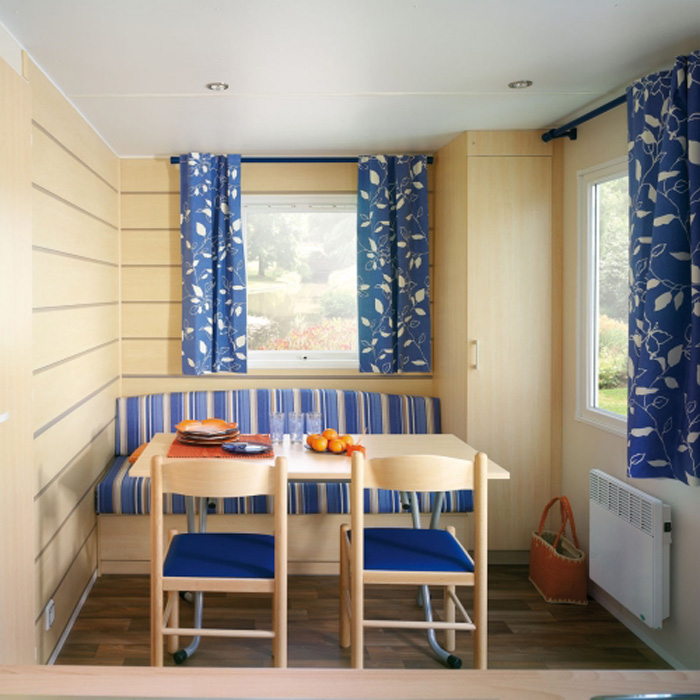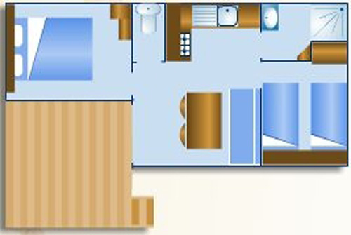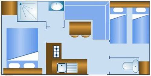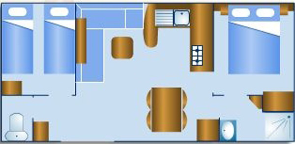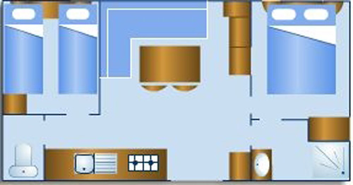 Mobil Home 4/5 personnes de 21 ou 24m², composé d'une chambre avec un lit double, d'une chambre avec 2 lits séparés et d'une banquette convertible pour 2 personnes, d'une salle de bain avec douche et d'un WC.