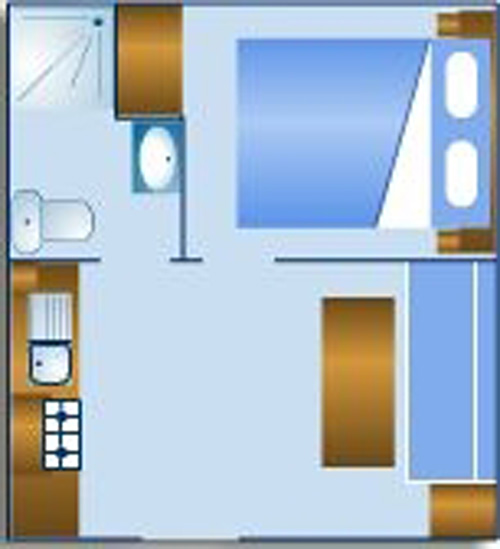 Mobil Home 2 personnes de 16m², composé d'une chambre avec un lit double, d'une cuisine équipée et d'une salle de bain avec toilettes ainsi qu'une terrasse extérieure.