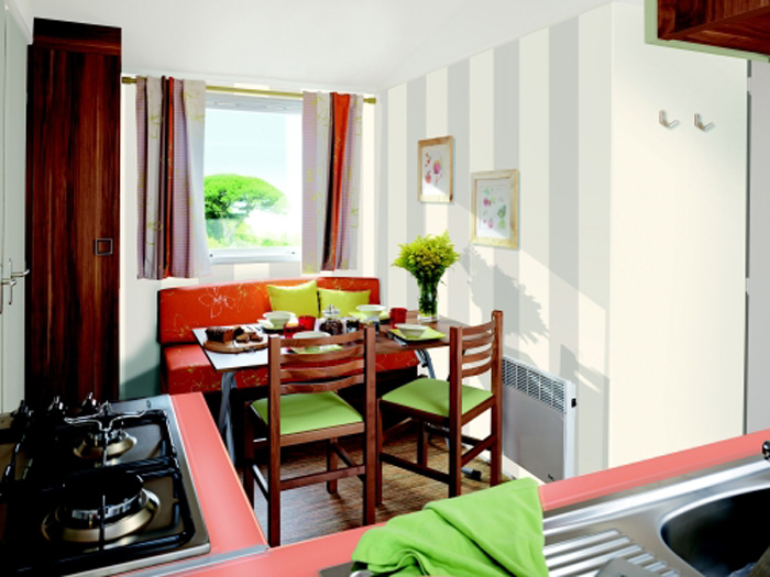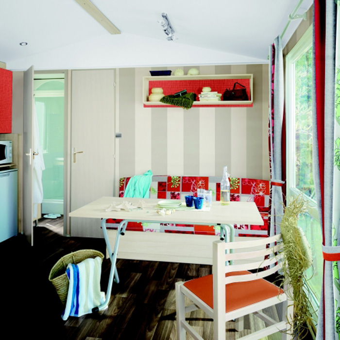 Mobil Home 4/5 personnes de 30m², composé d'une chambre avec un lit double et d'une chambre de 2 lits séparés ainsi qu'une banquette lit dans le séjour, d'un coin cuisine équipée, d'une salle d'eau avec douche et de toilettes séparées.