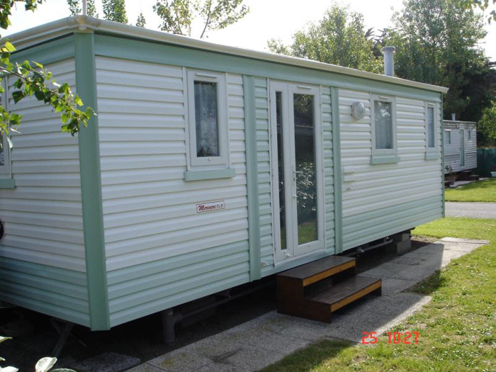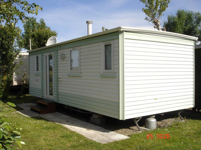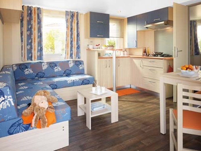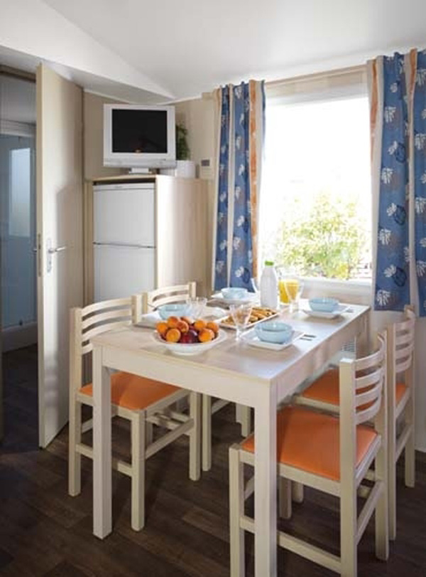 Mobil Home de 4 personnes de 24m², composé d'une chambre avec lit double et d'une chambre avec 2 lits séparés, d'une salle de bain et de toilettes séparées. il dispose également d'une cuisine toute équipée et d'une télévision.