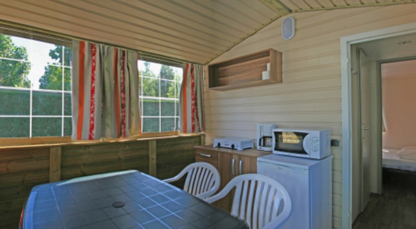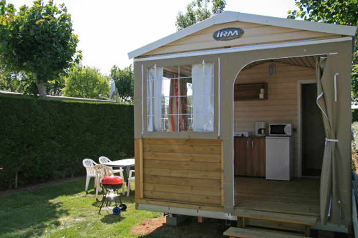 Bungalow 5 personnes de 18m², composé d'une chambre avec lit 2 personnes, 1 chambre avec 2 lits supersposés et 1 lit gigogne, un coin cuisine équipée, un salon de jardin. A noter: ce locatif n'est pas équipé de sanitaire. Les sanitaires collectifs du camping sont situés à proximité