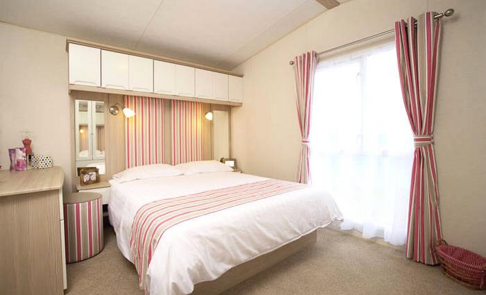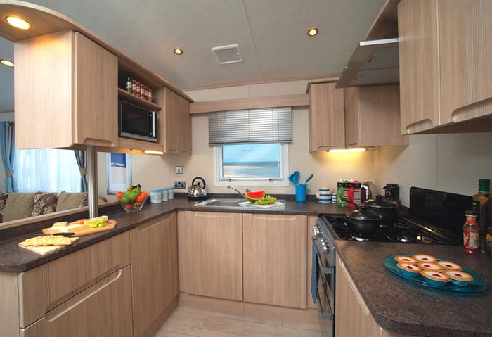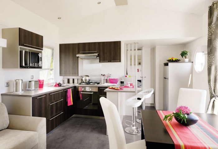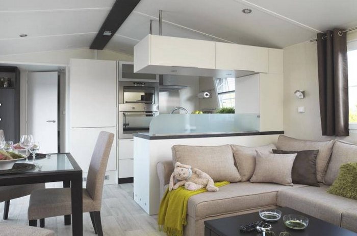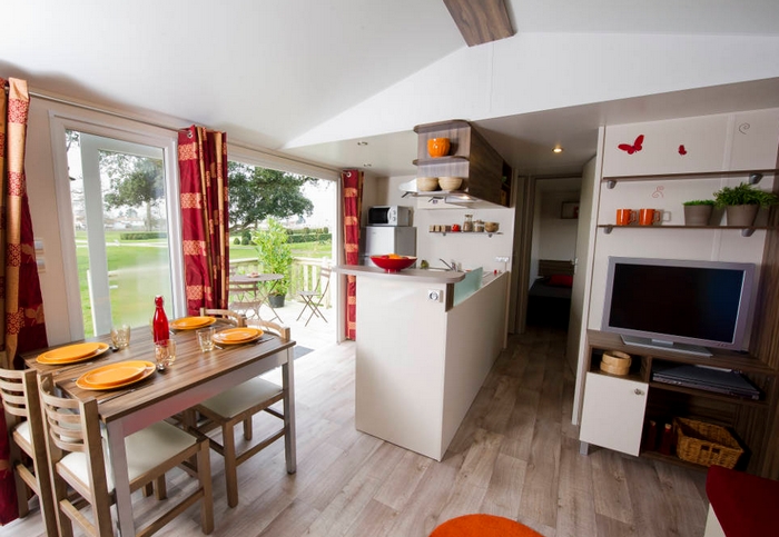 Mobil Home de 31 à 36m² 4 Pièces 6/8 Personnes composé d'un coin cuisine équipé, d'un coin repas, d'une chambre avec 1 lit double, d'une chambre avec 2 lits simples, d'une salle de bain et de WC.