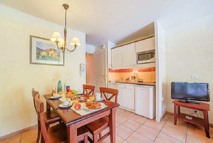 Appartement équipé d'une kitchenette avec 4 plaques vitrocéramiques, réfrigérateur, four micro-ondes, lave vaisselle et cafetière électrique. Terrasse ou balcon avec mobilier de jardin.