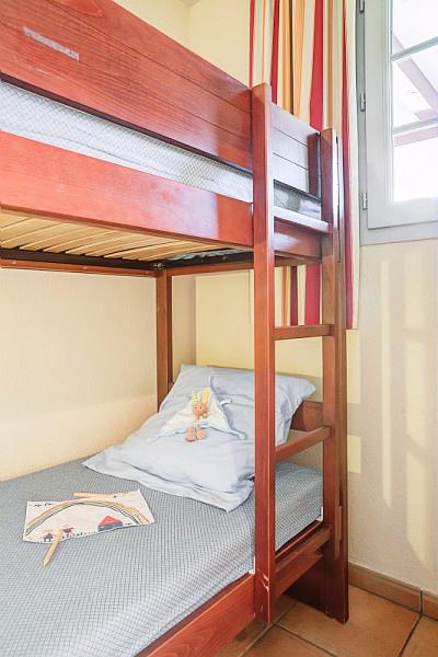 Studio de 32m² pour cinq personnes comprenant un séjour avec deux lits banquettes et un lit gigogne, une cabine avec deux lits superposés, une salle de bains et des toilettes séparés.