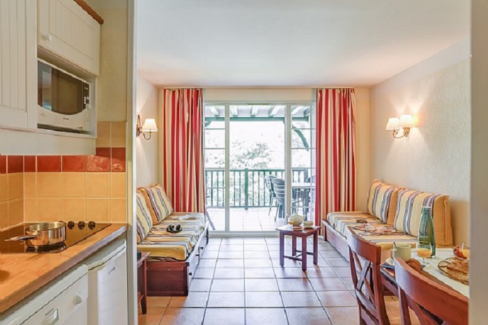 1 séjour, 1 coin cabine, 1 coin cuisine, 1 salle de bains avec 1 WC. Équipements séjour : 2 lits-banquettes et lit gigogne (3 couchages). Coin cabine : 2 lits simples superposés. Côté repas : une table avec 4 chaises et 1 tabouret. Équipements salle de bains : 1 baignoire avec 1 WC. Équipements dans la cuisine : Coin cuisine ouvert sur le séjour. Équipements terrasse : 1 table avec 5 chaises. Superficie : environ 32 m². Les atouts de ce logement : Wifi, accès direct au parc, terrasse, lave-linge et piscine commune, appartement remis au goût du jour récemment. Label Maeva Particuliers Confort : le bon rapport qualité/prix. Des prestations correctes, un logement entretenu et équipé des principales commodités. L?essentiel pour des vacances au meilleur prix.