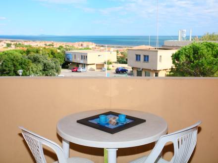 Saint Pierre la Mer (11) - Quartier du Centre - Résidence le Palais de la MéditérranéeAppartement 2 pièces mezzanine - 25 m environ- jusqu'à 4 personnesSitué à 500m de la plage et 300m des premiers commerces, dans le quartier du Centre, résidence d?hébergements de vacances composée de 4 petits bâtiments de 3 étages.Cette location à de vacances à la plage située au 3ème étage comprend un séjour avec télévision, un coin cuisine équipé, une chambre non fermée avec un canapé convertible 2 personnes, et une salle d'eau avec wc. Mezzanine basse avec 1 lit 2 personnesLes Plus de cet appartement de vacances : terrasse avec belle vue mer, à 5 minutes à pieds des commerces. Séjour : Chambre 1 : Nombre de lit double : 1 Mezzanine : Nombre de lit double : 1 Equipements fournis : Frigo LaveLinge LaveVaisselle Fer MicroOnde Televiseur
