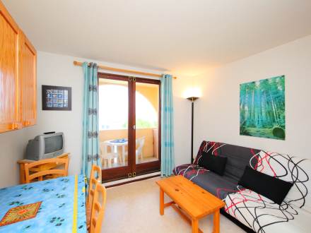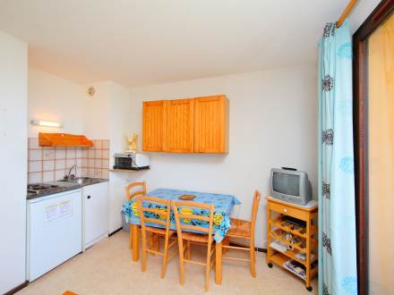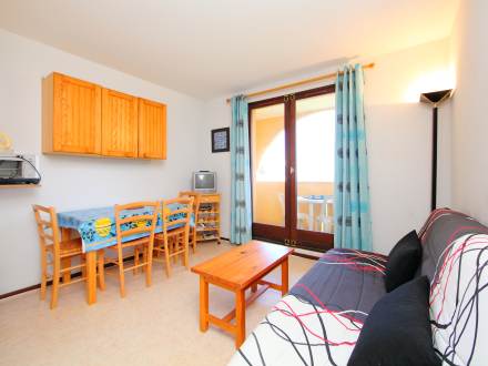 Studio 25 m2 au 2ème étage: séjour/salle à manger avec 1 divan-lit double et TV. Alcôve avec 1 x 2 lits superposés. Coin cuisine (2 plaques de cuisson, four). Douche/WC. Chauffage électrique. Balcon 4 m2, situation sud-est. Meubles de terrasse. Vue sur la mer. Maximum 1 animal/ chien autorisé.