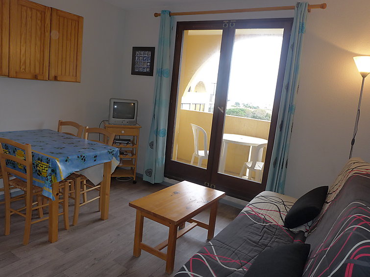 Saint Pierre la Mer (11) - Quartier du Centre - Résidence le Palais de la MéditerranéeAppartement studio cabine - 17 m environ - jusqu'à 4 personnesSitué à 500m de la plage et 300m des premiers commerces, dans le quartier du Centre, résidence d?hébergements de vacances composée de 4 petits bâtiments de 3 étages.Cette location meublée de vacances située au 3ème étage comprend un séjour avec un canapé convertible pour 2 personnes et une télévision, un coin cuisine équipé, un coin cabine avec 2 lits superposés 1 personne, et une salle d'eau avec wc.Les Plus de cet appartement de vacances : Loggia avec belle vue mer, à 5 minutes à pieds des commerces. Séjour : Nombre de lit double : 1 Coin Cabine : Nombre de lit simple : 2 Equipements fournis : Frigo LaveLinge MicroOnde Televiseur