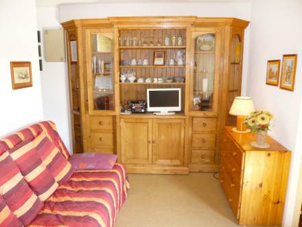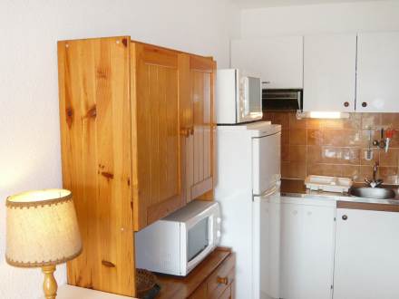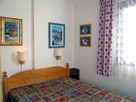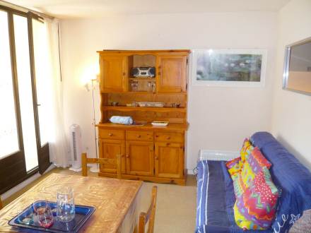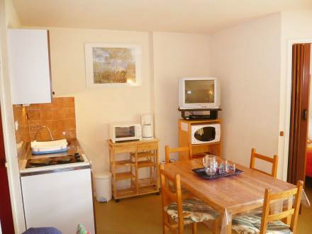 Apt 2 pièces 29 m2 au 1er étage: séjour/salle à manger avec 1 divan-lit double, TV, lecteur CD et DVD. 1 chambre avec 1 grand-lit. Coin cuisine (2 plaques de cuisson, four, four micro-ondes, congélateur). Douche/WC. Meubles de terrasse. Loggia, 3 m2 (fermée par une baie coulissante), exposition sud-ouest. Radiateur à huile.
