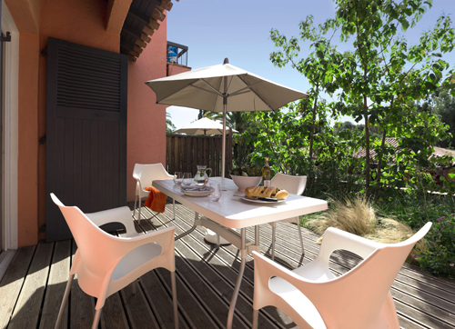 Appartement 2 pièces de 37m² pouvant accueillir jusqu'à 5 personnes dans la partie "Roche Rouges" à l'étage et composé d'un séjour avec une banquette-lit gigogne (2 couchages) et un lit simple, d'une chambre avec 2 lits simples, d'une kitchenette équipée et d'une salle de bain avec douche ou baignoire et WC. L'appartement dispose d'une belle terrasse avec mobilier de jardin.L'ajout d'un lit bébé est possible.Le logement peut accueillir 5 personnes + un bébé de moins de 2 ans. La 6ème personne ne peut pas être un adulte ni un enfant mais uniquement en bébé de moins de 2 ans.