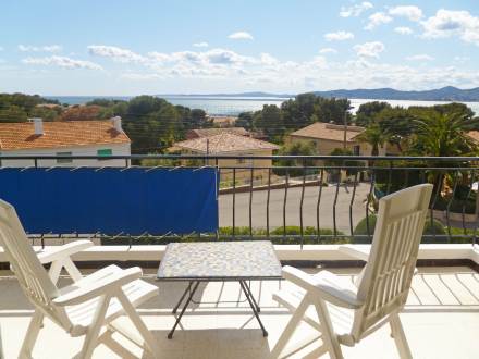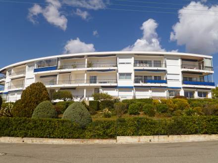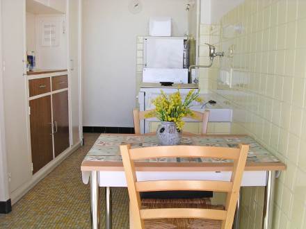 Apt 2 pièces 44 m2 au 1er étage: séjour/salle à manger avec TV. 1 chambre avec 2 lits. Cuisine (4 plaques de cuisson, four, lave-vaisselle, four micro-ondes, congélateur). Salle de bains, WC séparé. Terrasse 12 m2. Meubles de terrasse. Belle vue sur la mer. A disposition: lave-linge. Place de parking.