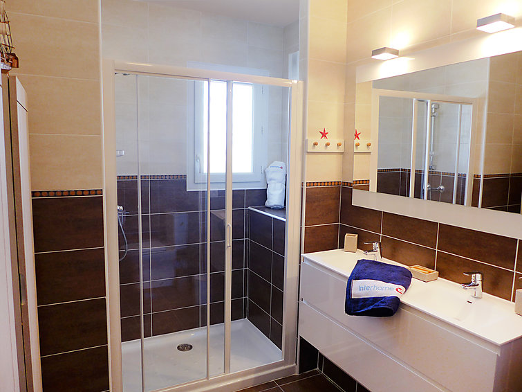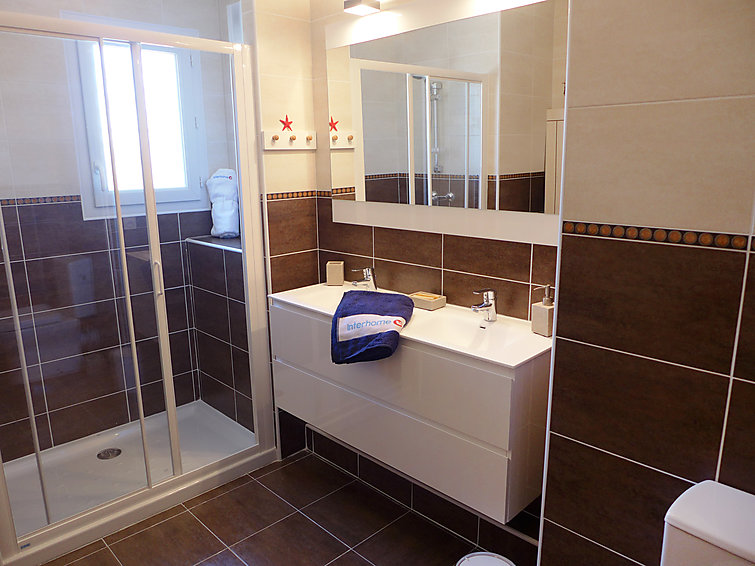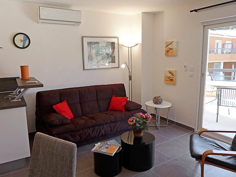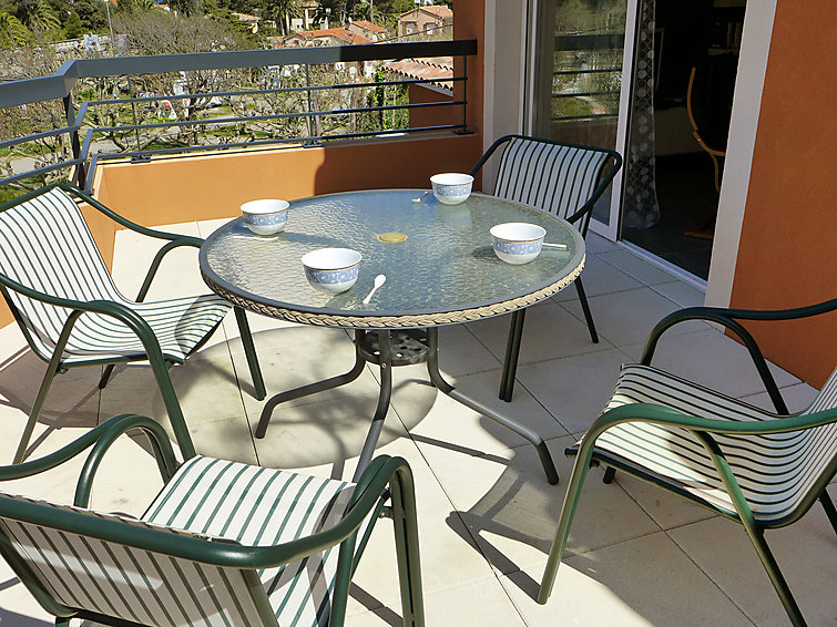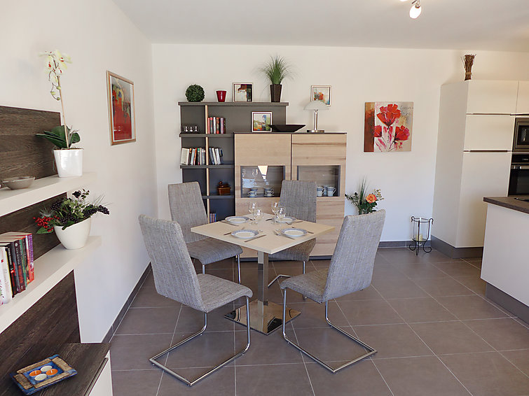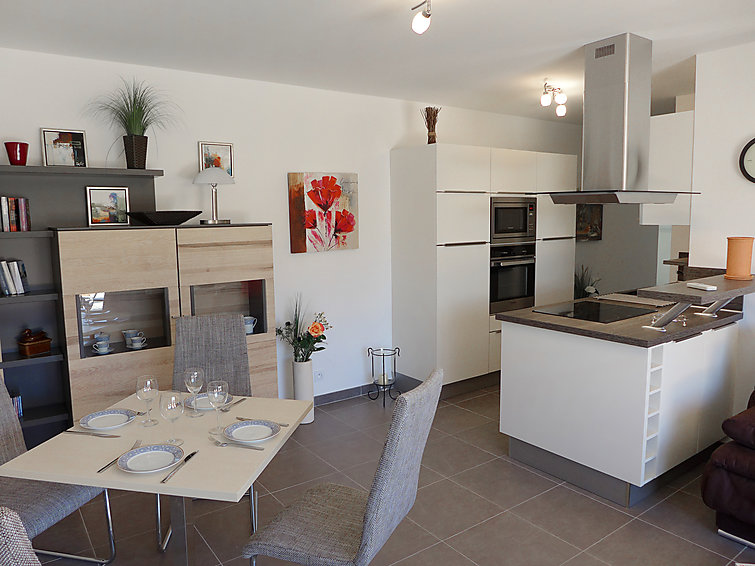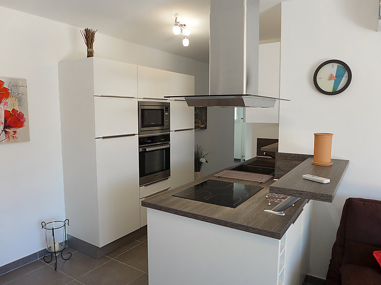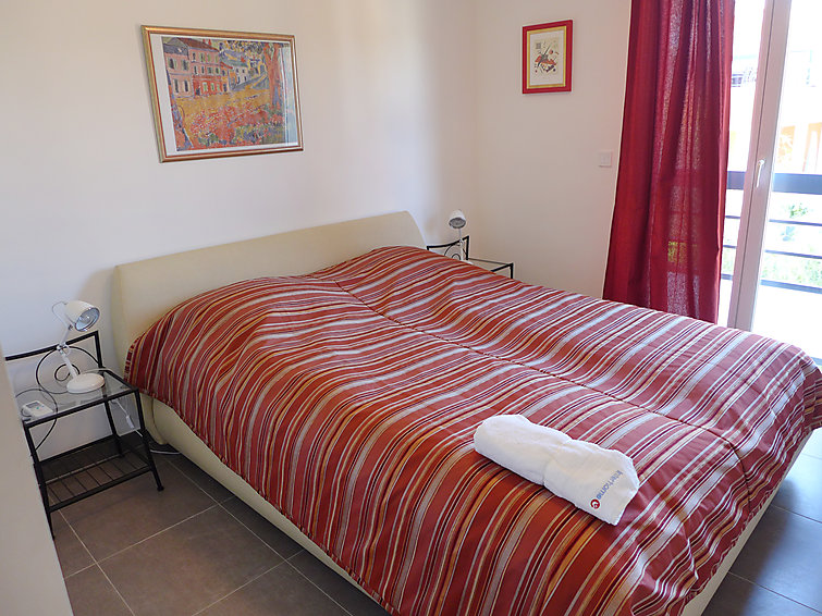 Apt 2 pièces 55 m2 au 2ème étage, clair, aménagement moderne: séjour/salle à manger avec 1 divan-lit double (1 x 140 cm, longueur 190 cm), écran plat et air-conditionné. Sortie sur la terrasse. 1 chambre avec 1 grand-lit (1 x 160 cm, longueur 200 cm). Sortie sur la terrasse. Cuisine ouverte (four, lave-vaisselle, 4 plaques à induction, four micro-ondes, congélateur, cafetière électrique). Douche/WC, double vasque. Air-conditionné. Terrasse 13 m2. Meubles de terrasse. Vue partielle sur la mer et les montagnes. A disposition: lave-linge, fer à repasser. Garage No 11, hauteur 220 cm. Veuillez noter: logement pour non fumeurs.