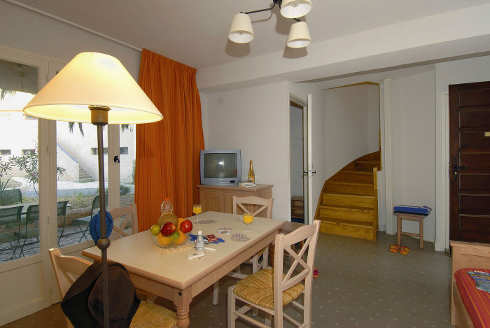 Appartement de 3 pièces pour 8 personnes de 49 à 54m² composé d'un séjour avec un lit gigogne pour deux personnes, d'une chambre avec un lit double, de deux cabines avec porte et petite fenêtre et deux lits superposés chacune, d'une kitchenette bien équipée, d'une salle de bains et d'une salle de douche avec toilettes..