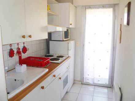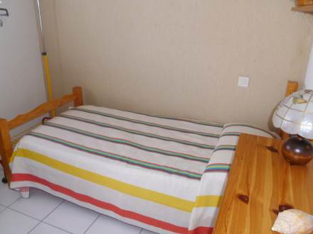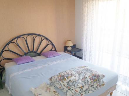 "Les Pins Maritimes", apt 3 pièces 70 m2 au 2ème étage, aménagement simple: séjour/salle à manger avec TV (satellite). Sortie sur la terrasse. 1 chambre avec 1 lit (140 cm). 1 chambre d'enfants avec 1 lit gigogne (2 x 90 cm). Cuisine (4 plaques de cuisson, four, lave-vaisselle, four micro-ondes). Salle de bains, WC séparé. Chauffage électrique. Terrasse 15 m2. Meubles de terrasse.