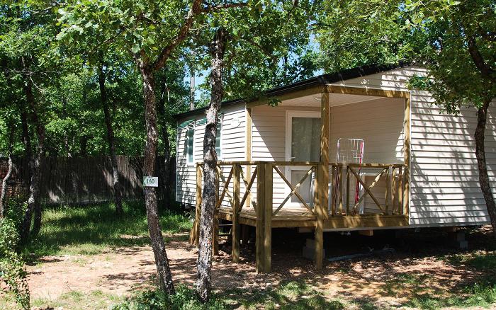 Cottage de 3 pièces de 21m² pouvant accueillir 4 personnes. Il est composé d'un séjour avec coin repas, d'une cuisine équipée, d'une chambre avec 1 lit double (190cm), d'une chambre avec 2 lits simples (70cm) et d'une salle de bain avec douche, lavabo et WC indépendant. Terrasse couverte de 11m².