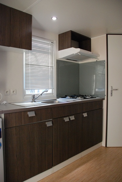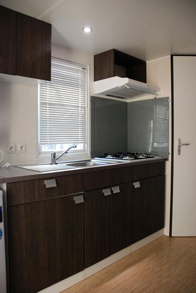 Le Mobil Home comprend un coin cuisine équipé avec réfrigérateur, plaque de cuisson, micro-ondes, cafetière électrique. Ustensiles et vaisselle pour 6 personnes. La terrasse comprend un salon de jardin et 2 transats.