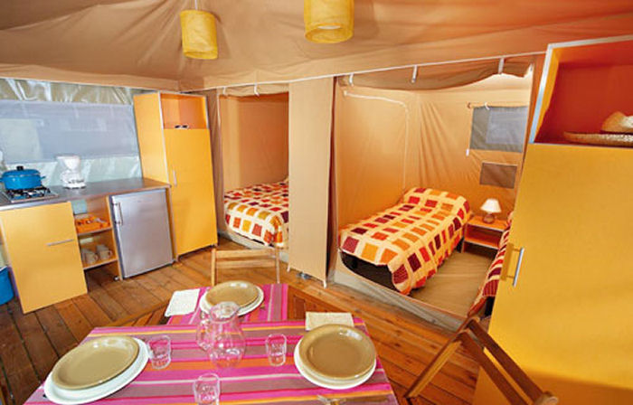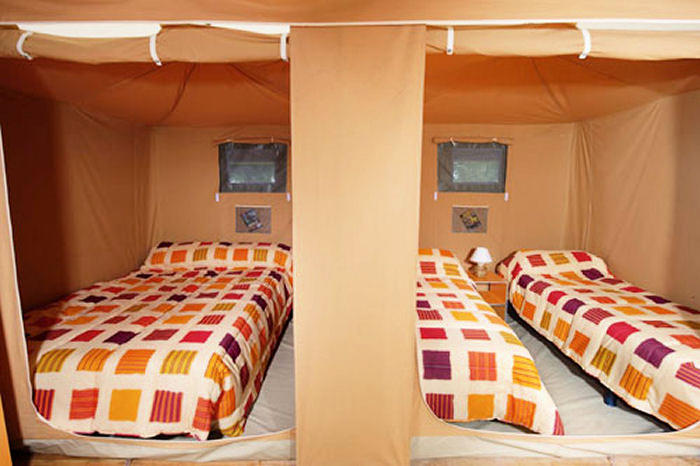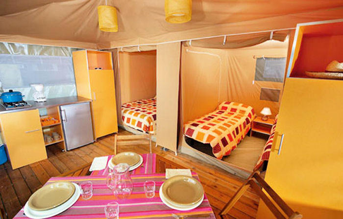 Pour avoir plus de détails et réserver cet hébergement, choisissez une date ci-dessus et cliquez sur voir l'offre ! Vous serez redirigé vers le site proposant la location.Bungalow toilé de 3 pièces de 20m² pouvant accueillir 4 personnes.Il est composé d'un séjour de 10m² avec coin cuisine équipé avec grande baie translucide, d'une chambre avec 1 lit double et d'une chambre avec 2 lits simples.Terrasse en bois de 10m².