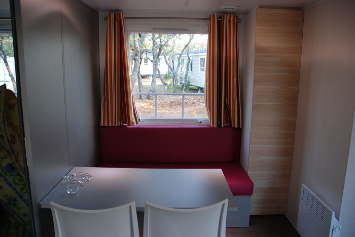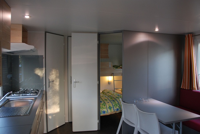 Mobil Home 4 Pièces 6 Personnes d'environ 22m² composé d'un coin séjour, d'un coin cuisine équipé, d'une chambre avec 1 lit double, de deux chambres avec 2 lits simples chacune, d'une salle d'eau et de WC séparé.