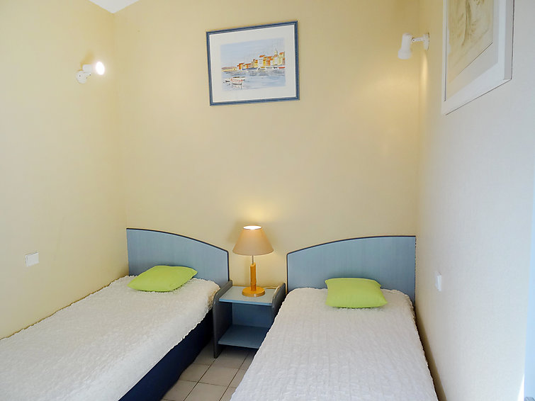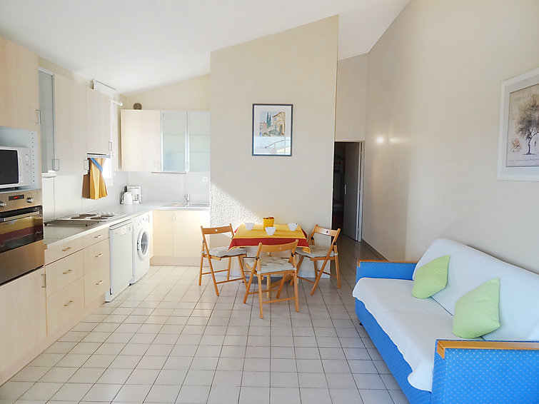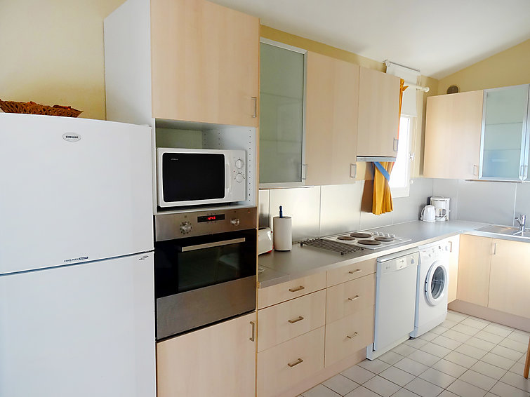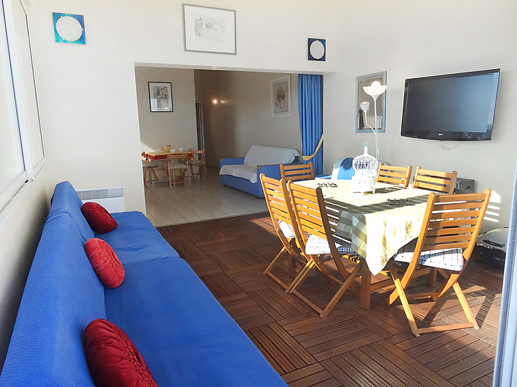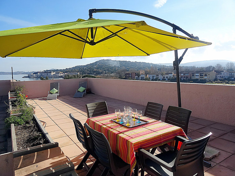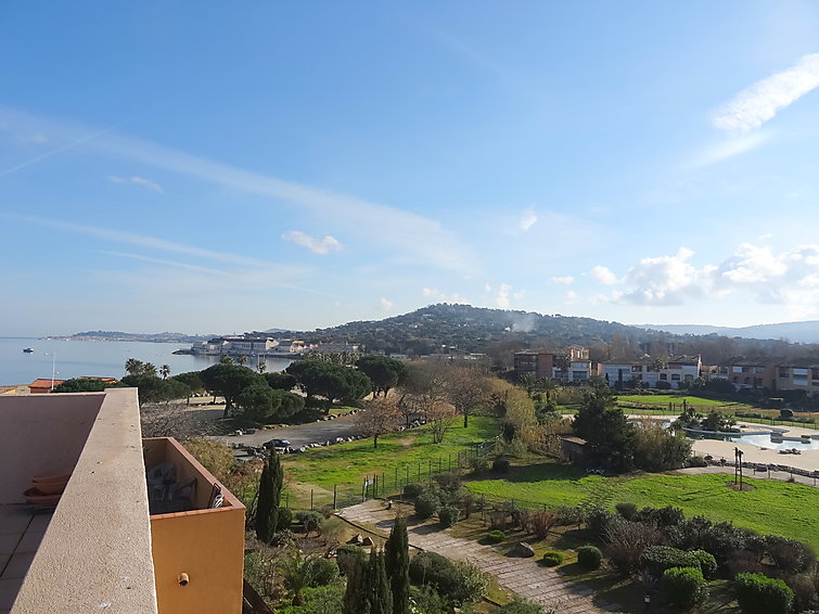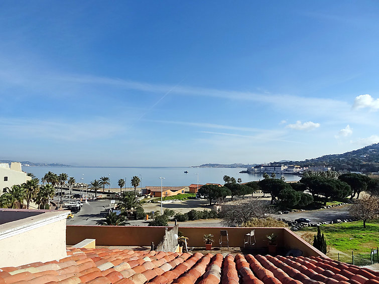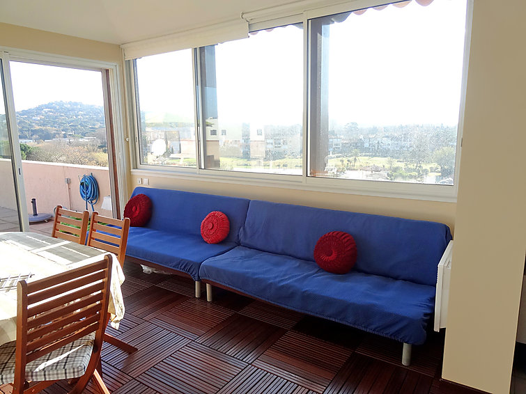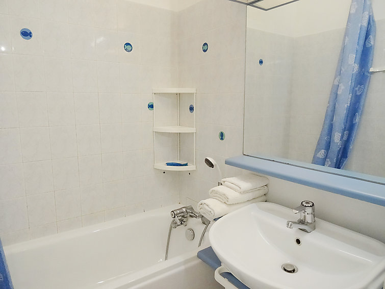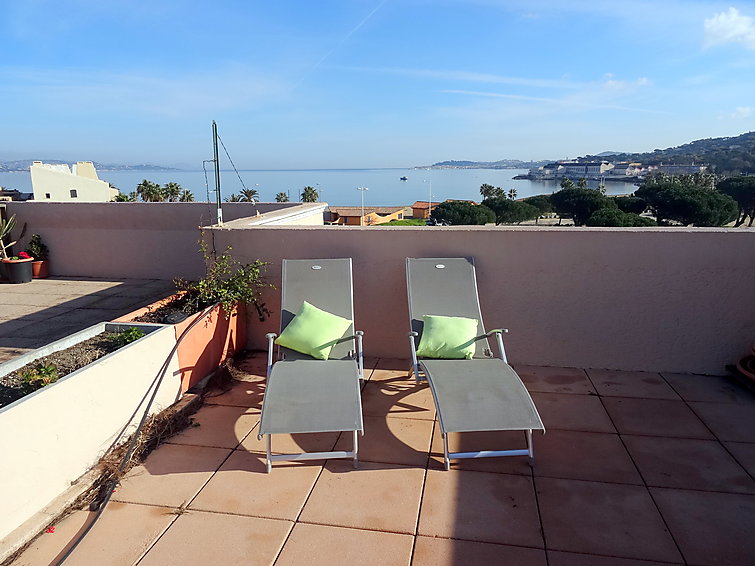 Apt 3 pièces 45 m2 au 4ème étage. Spacieux, aménagement confortable: séjour/salle à manger avec 2 lits, 1 divan-lit double et TV (écran plat). Sortie sur la terrasse. 1 chambre avec 2 lits. 1 chambre avec 1 x 2 lits superposés. Cuisine ouverte (4 plaques de cuisson, four, lave-vaisselle, four micro-ondes, congélateur). Salle de bains, douche/WC. Grande terrasse 60 m2. Meubles de terrasse, barbecue électrique. Superbe vue sur la mer et la piscine. A disposition: lave-linge, sèche-cheveux. Place de parking.