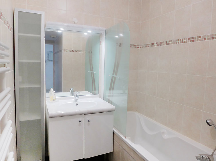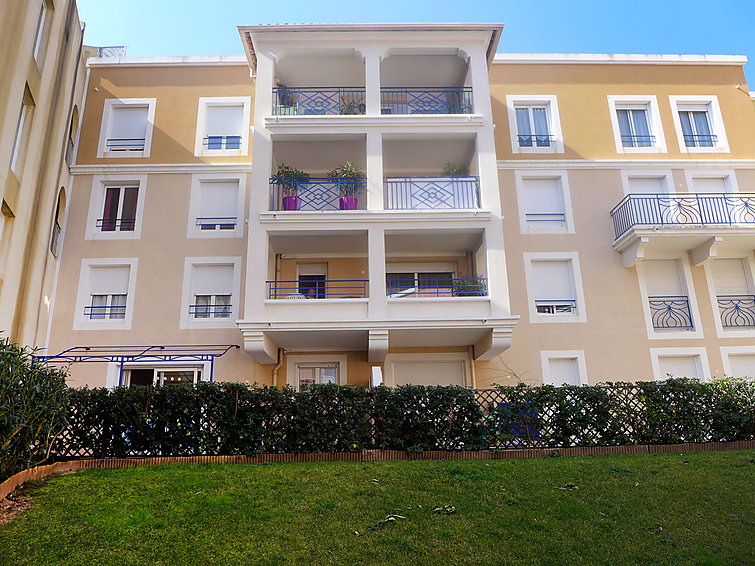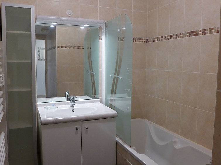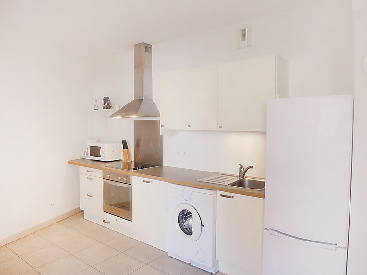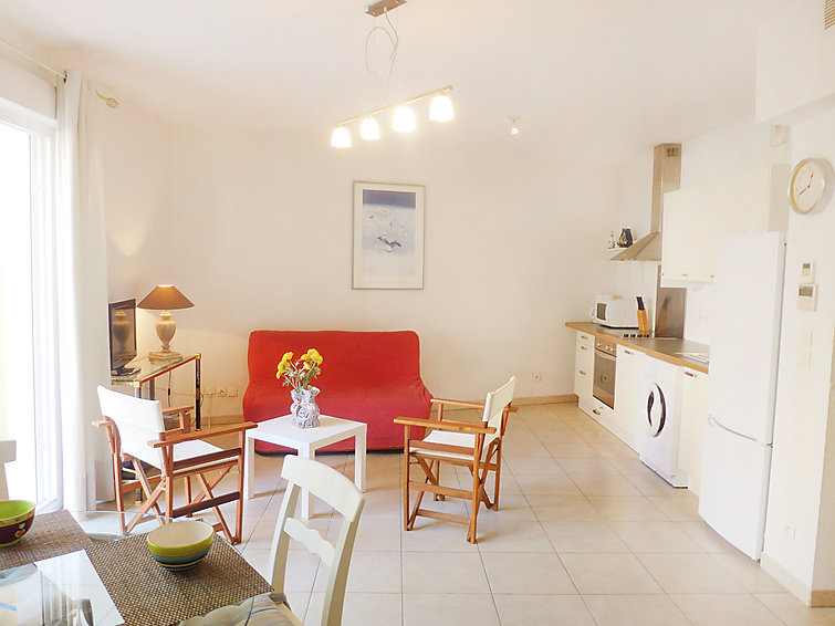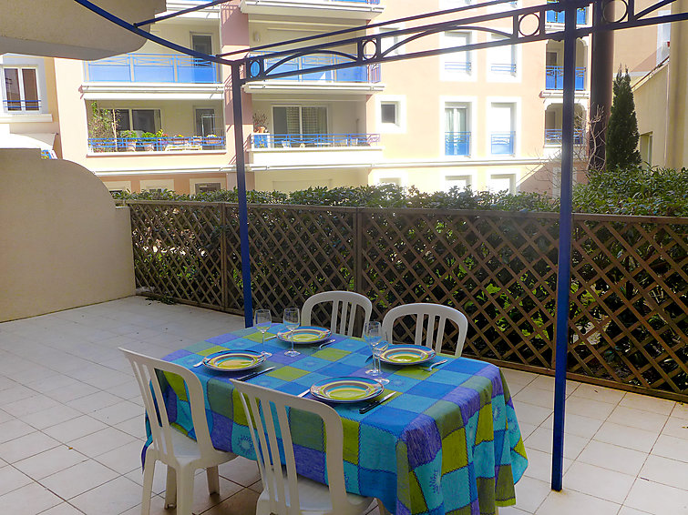 Apt 2 pièces 45 m2, au rez-de-chaussée. Séjour/salle à manger avec 1 divan-lit double, TV, air-conditionné et volet roulant électrique. Sortie sur la terrasse. 1 chambre avec 2 lits (90 cm, longueur 200 cm), air-conditionné. Sortie sur la terrasse. Coin cuisine (four, lave-vaisselle, 4 plaques vitrocéramique, four micro-ondes, congélateur). Salle de bains, WC séparé. Terrasse 33 m2, situation est. Meubles de terrasse. A disposition: lave-linge. Garage. 1 animal/ chien autorisé.
