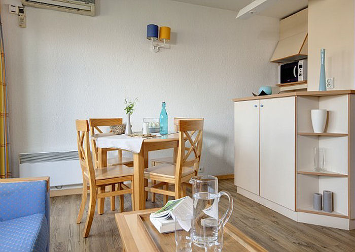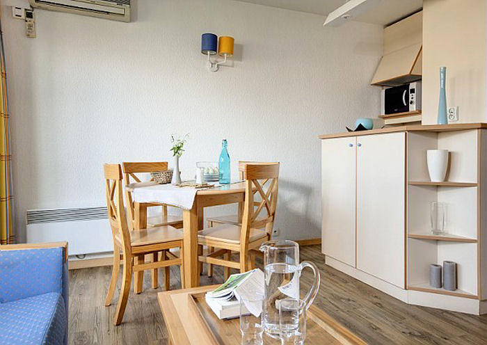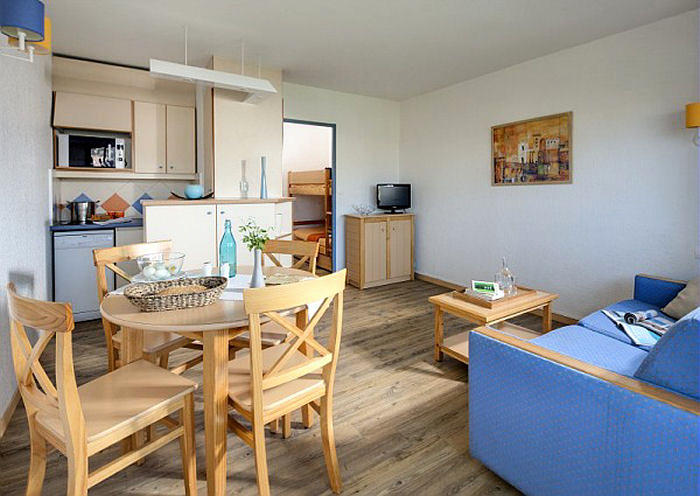 Studio pour 4 personnes d'environ 27m² comprenant un séjour avec 2 canapés lits simples, une entrée avec 2 lits superposés séparée du séjour par une porte, une salle de bain avec baignoire ou douche, des toilettes séparées, un coin cuisine équipé et un balcon ou une terrasse.A noter : - Le couchage en hauteur ne convient pas aux enfants de moins de 6 ans.- Aucun appartement vue mer.