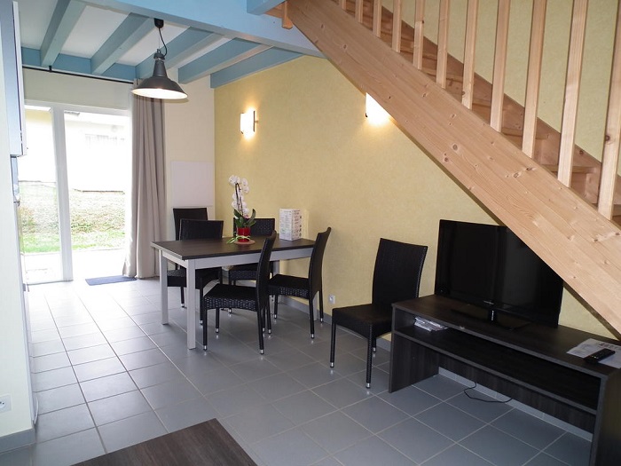 Cottage 3 pièces 6 personnes de 46 m², composé de deux chambres avec 2 lits simples modulable en lit double, d'un séjour avec canapé convertible, d'une kitchenette équipée, et d'une salle de bains à chaque étage avec douche ou baignoire et WC.