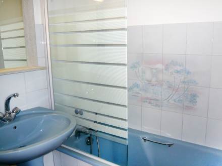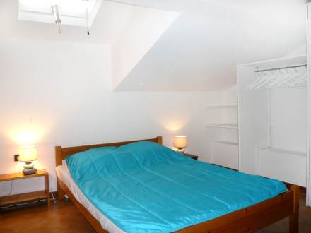 Studio 27 m2 sur 2 niveaux, aménagement confortable et agréable: entrée, sans fenêtre avec 1 x 2 lits superposés (80 cm, longueur 190 cm). Séjour avec table pour les repas et TV. Sortie sur la loggia. Coin cuisine (2 plaques de cuisson, mini-four, cafetière électrique). Salle de bains, WC séparé. Chauffage électrique. À l'étage supérieur: (escalier raide) galerie, mansardée, ouverte hauteur plafond 177 - 230 cm avec fenêtre sous le toit avec 1 grand-lit (140 cm, longueur 190 cm). Loggia. Très belle vue sur la mer. Place de parking No 35. Veuillez noter: TV seulement FR.
