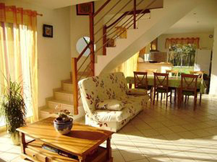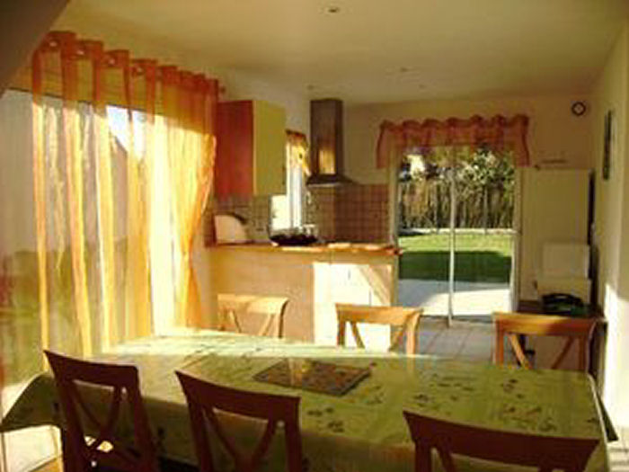 Maison moderne située au calme dans une impasse sur les hauteurs de St Jacques .Le rez-de-chaussée :- Un spacieux séjour / salle à manger offrant une vue sur le jardin. - Une cuisine toute équipée ouverte sur le séjour / salle à manger.- Une chambre avec un lit double en 160 avec une salle de bain privative équipée d une douche - Accès sur la terrasse.- Wc séparés.L étage :- Une chambre avec un lit double en 140- Une chambre avec un lit double en 140 et un lit d enfant, qui communique avec une chambre cabine équipée d un lit simple avec un lit tiroir.- Une salle de bain avec une baignoire / wc.L extérieur :- Jardin clos avec terrasse équipée d un salon de jardin, de transats et barbecue.- Pergola électrique- Stationnement devant la maison- Garage pour ranger des vélosA noter :- Linge de lit et de toilette non fourni- Electricité en sus sur le relevé du compteur de novembre à mars.- Le prix de la taxe de séjour variable sera adapté sur place. Nous contacter pour connaître le montant exact.
