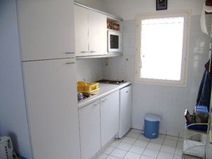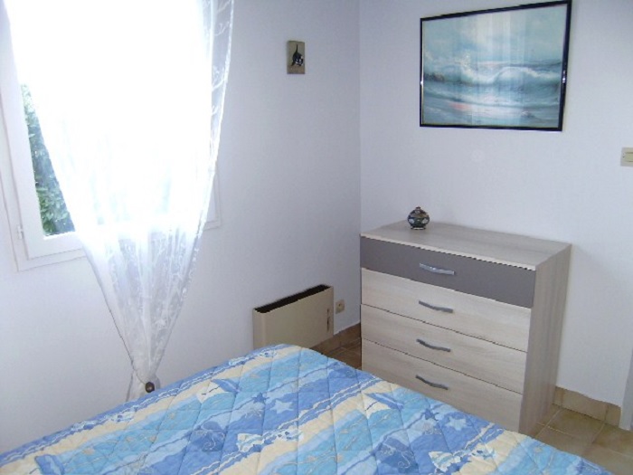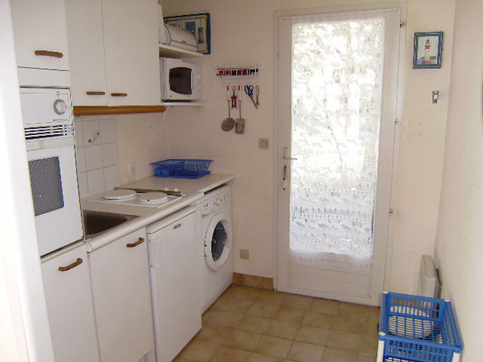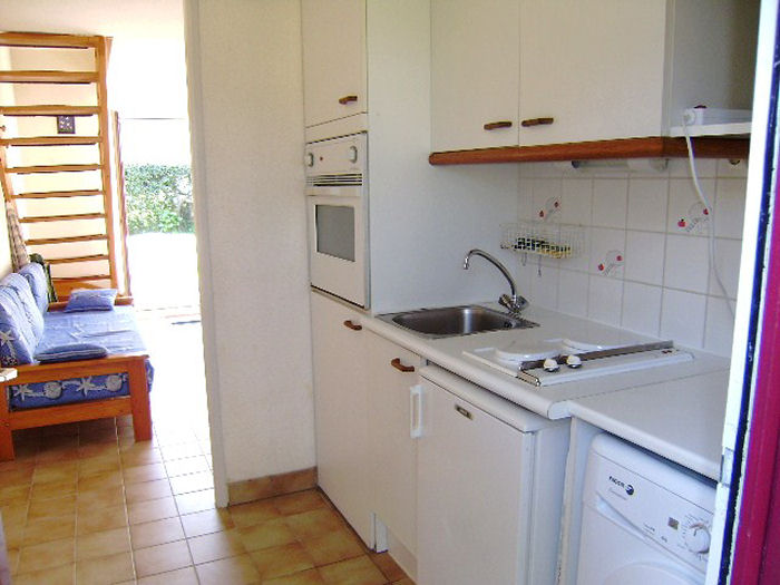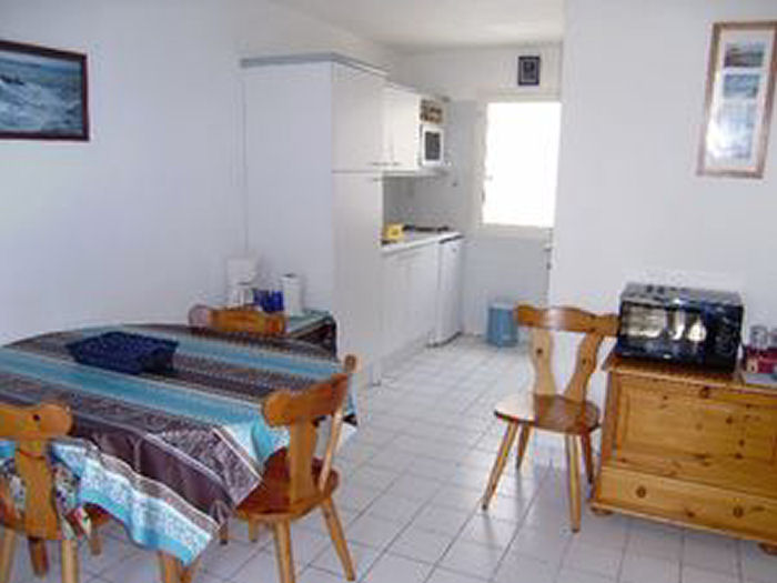 Maisonnette 3 pièces 4/6 personnes, de 50m², composé au rez de chaussée d'un séjour avec canapé-lit (2 personnes) et d'une kitchenette équipée.A l'étage, une salle de bains avec baignoire et WC séparés, une chambre avec un lit double et une chambre avec 2 lits simples.La maisonnette dispose également de 2 petits jardins clos avec terrasse et store, un cellier et un garage individuel.